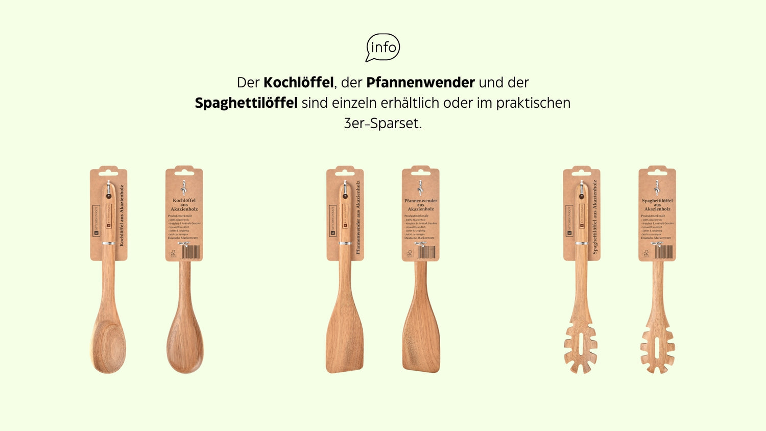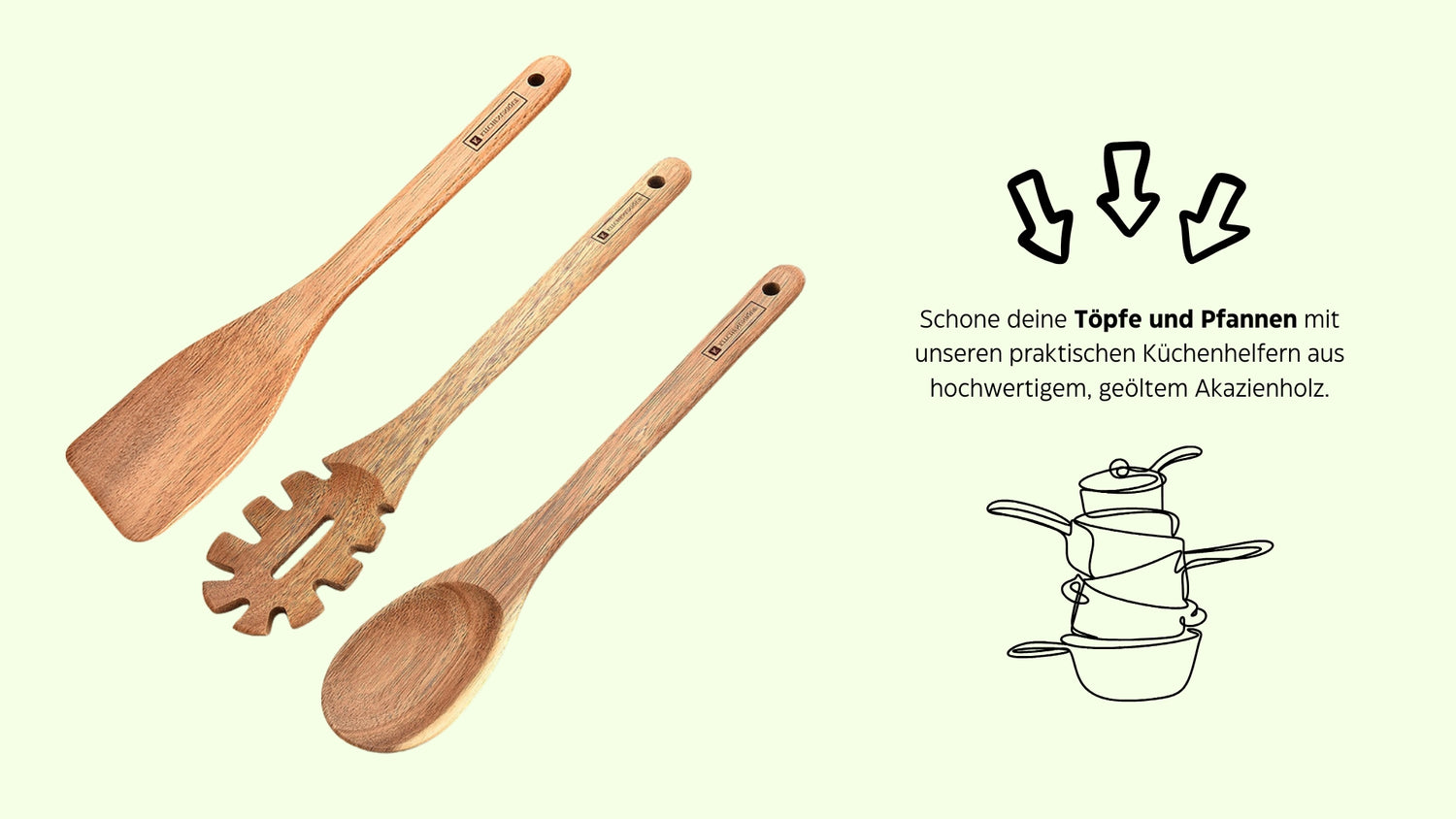 Unser Akazienholz stammt aus nachhaltigem Holzabbau. Um die Umwelt zu schonen und Ressourcen effizient zu nutzen, bieten wir unsere Küchenhelfer sowohl einzeln als auch im Set an. So kaufst du nur das, was du wirklich brauchst.